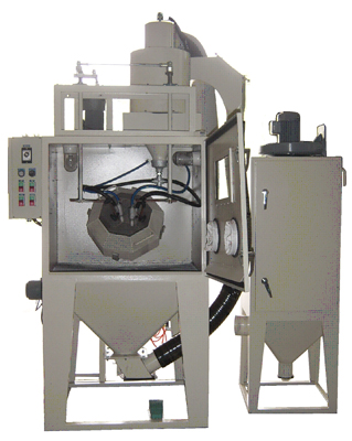 具有定時停止,自動、手動噴砂、呼叫等功能,內裝噴槍2組,可採單動或聯動式,工件取放容易。採旋風式設計,更能增加噴砂之效率。